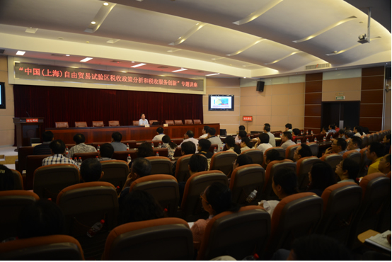 9月26日,胡怡建教授接受湖北省国家税务局邀请,专程赴武汉为湖北省国家税务局作“中国(上海)自由贸易试验区税收政策分析和税收服务创新”专题讲座。从如何看自贸区改革创新、如何评价自贸区税收政策、如何透过自贸区看税收趋势等三个方面具体分析了上海自贸区税收政策,并阐述了开放、转型、改革中的税收使命。省局领导、省局学习借鉴上海自贸区经验开展先行先试工作领导小组成员单位负责人及处室人员、机关其他处室人员、武汉市局领导及相关处室人员、武汉东湖新技术开发区局领导及相关科室人员近200人现场听取了专题讲座,全省各地国税局同步收看了讲座视频。讲座结束后,省局党组成员、副局长,省局学习借鉴上海自贸区经验开展先行先试工作领导小组组长姜锋同志就全省国税系统贯彻落实省委省政府文件精神,国税系统深入开展先行先试工作提出了进一步要求。