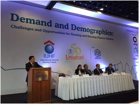 国际住房金融联合会(IUHF)世界大会每两年一次,参会代表以IUHF在世界各国上百个的会员单位--住房金融公司、行业协会和政府监管机构的代表为主,今年在巴西里约热内卢的会议是第29届,有49多个国家200多代表参加。陈杰教授是多年来唯一一位来自中国的演讲人。陈杰教授在9月3日大会开幕式后第二个专场中进行主题演讲,介绍了中国宏观经济形势、房地产市场形势和房地产金融的改革出路。演讲结束后得到现场听众热烈反响,很多嘉宾会后前来交流,其中包括巴基斯坦中央银行常务副行长、主办方IUHF主席、巴西城市部秘书长等嘉宾。其后嘉宾在他们的演讲中也多次引用陈杰发言观点与材料作为对中国房地产市场判断的论据。
