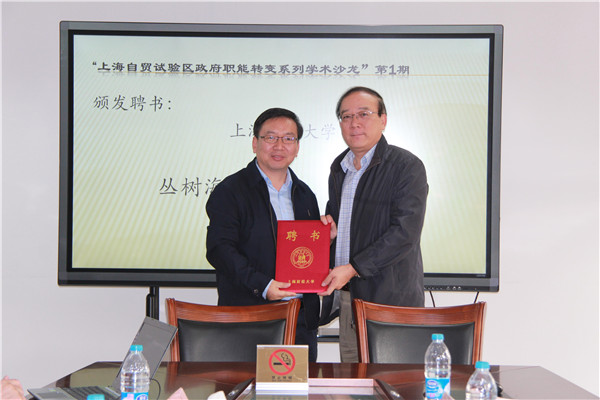 上海财经大学党委书记丛树海教授出席并为应邀参加研讨的复旦大学唐亚林教授、上海市政府机构编制办公室党政处处长董海军博士、上海市发改委综合改革处处长赵义怀博士、上海市政府发展研究中心发展改革处处长钱智博士等4位专家颁发中国行政体制改革研究会城市治理研究中心特聘研究员聘书。